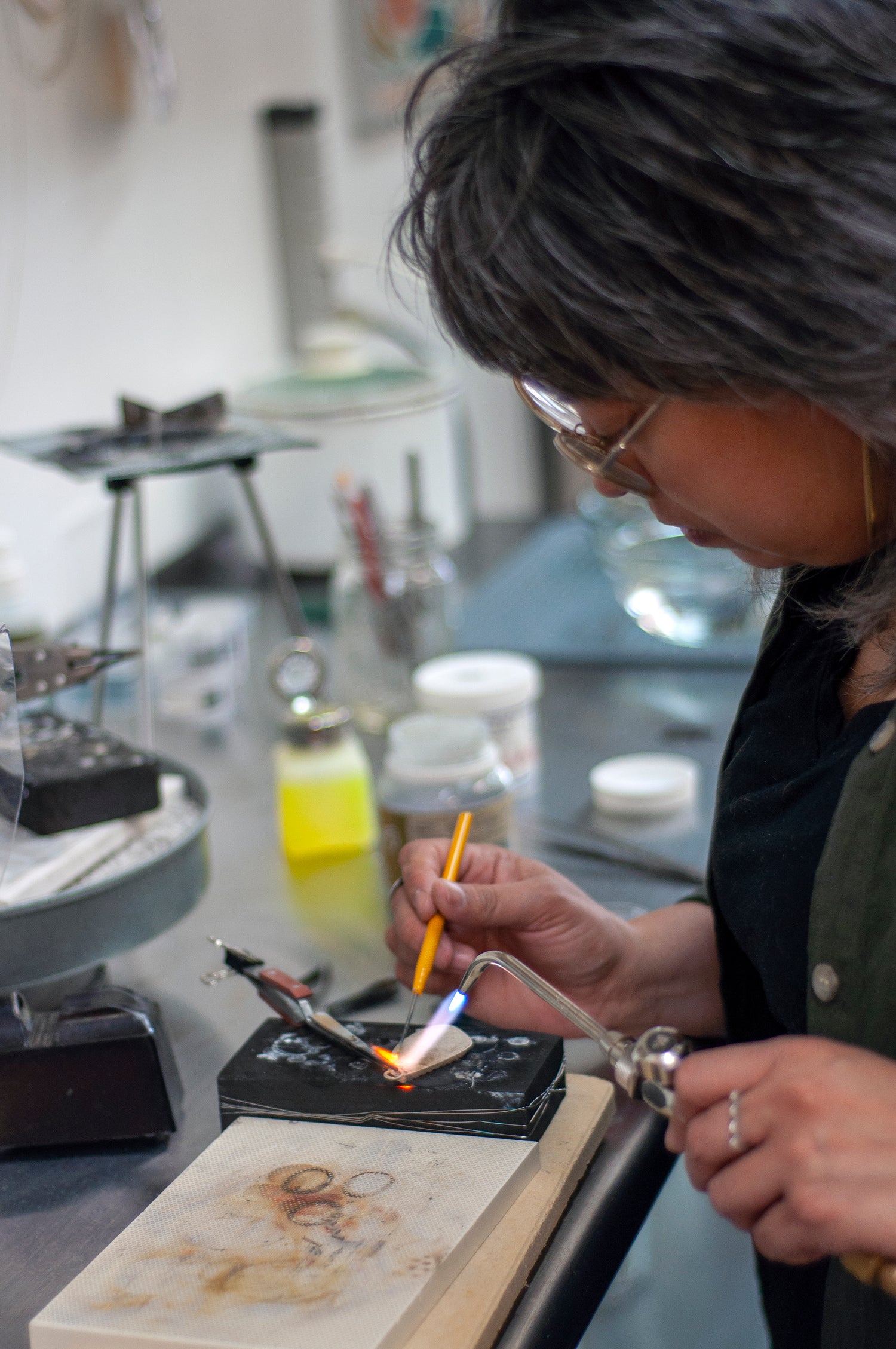 My inspiration has always been mid-century design, with geometric shapes, lines, curves, and negative space always shining throughout my work. Artists such as Art Smith and Alexander Caulder have heavily influenced my work. When I began this journey, I started crafting by cold forging wire. I honed that technique after several years and found a way for my voice to resonate in my jewelry. I built my brand with that signature style, but I had always wanted to expand my knowledge and technical skills in jewelry fabrication.